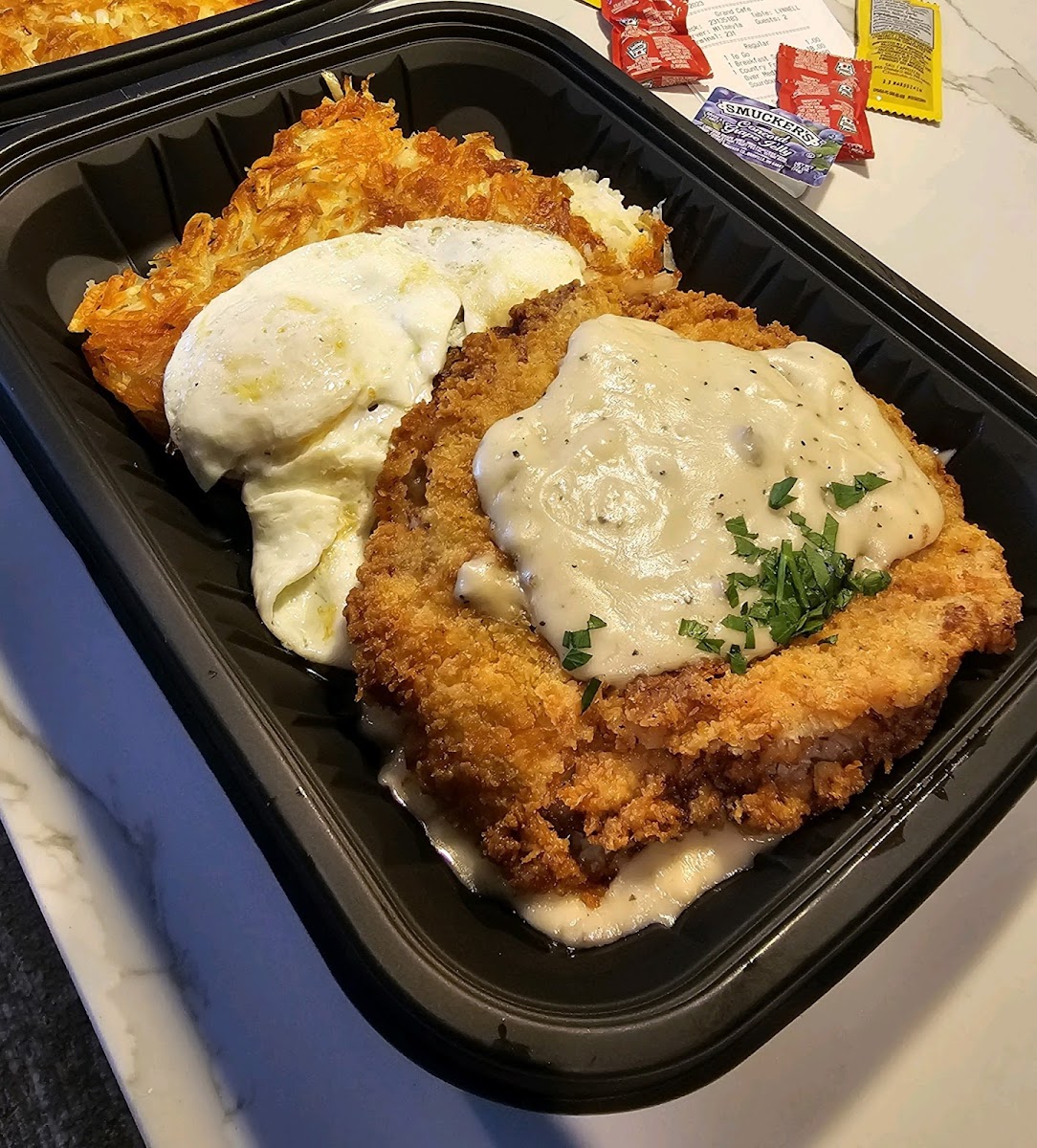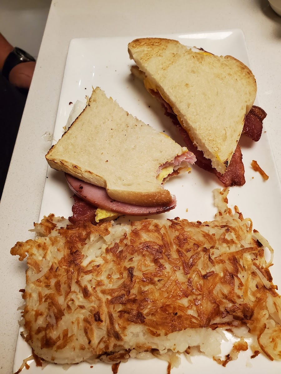 The menu leans heavily into familiar favorites like country fried steak and eggs, ham and cheese omelettes, and a range of sandwiches including their pulled pork and Philly cheesesteak. Portions are generous, matching the no-frills diner-style setting, and prices reflect the convenience and location rather than gourmet ambition. Breakfast items such as the Sierra Slam Combo and various French toasts with fresh fruit toppings are popular choices among early risers and those wanting a filling start before heading out.